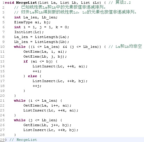 从上述问题要求可知,LC中的数据元素或是LA中的数据元素,或是LB中的数据元素,则只要先设LC为空表,然后将LA或LB中的元素逐个插入到LC中即可。为使LC中元素按值非递减有序排列,可设两个指针 i 和 j 分别指向LA和LB中某个元素,若设 i 当前所指的元素为 a,j 所指的元素为 b,则当前应插入到 LC 中的元素 c 为 c = a < b ? a : b显然,指针 i 和 j 的初值均为1(实际写代码时往往是从 0 开始的),在所指元素插入 LC 之后,在 LA 或者 LB 中顺序后移。上述归并算法如下图: