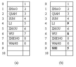 图1是书本上的静态链表示例,图(a)是初始化后插入了8个姓氏的链表,图(b)是在第5个元素前插入了“SHI”而删除了“WANG”的结果。