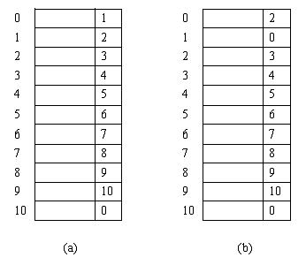 图3:模拟内存的数组状态。(a)初始化后的状态,(b)给静态链表分配头结点后的状态