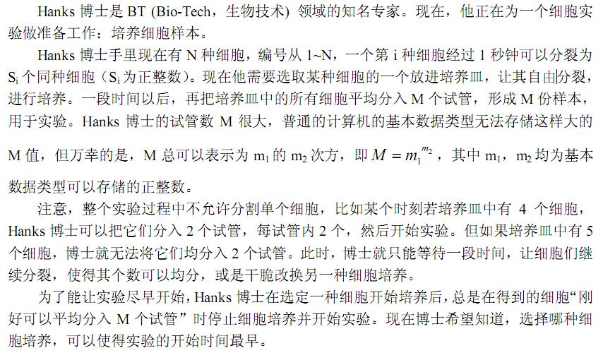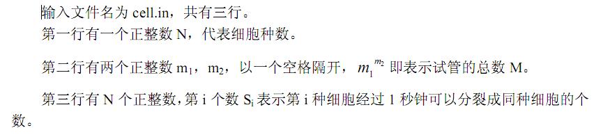 输出文件 cell.out 共一行,为一个整数,表示从开始培养细胞到实验能够开始所经过的