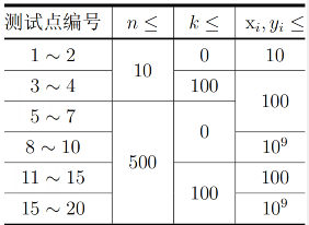 保证对于所有数据满足:1 ≤ n ≤ 500,0 ≤ k ≤ 100。对于所有给定的整点,其横纵坐标 1 ≤ xi , yi ≤ 109,且保证所有给定的点互不重合。对于自由添加的整点,其横纵坐标不受限制。